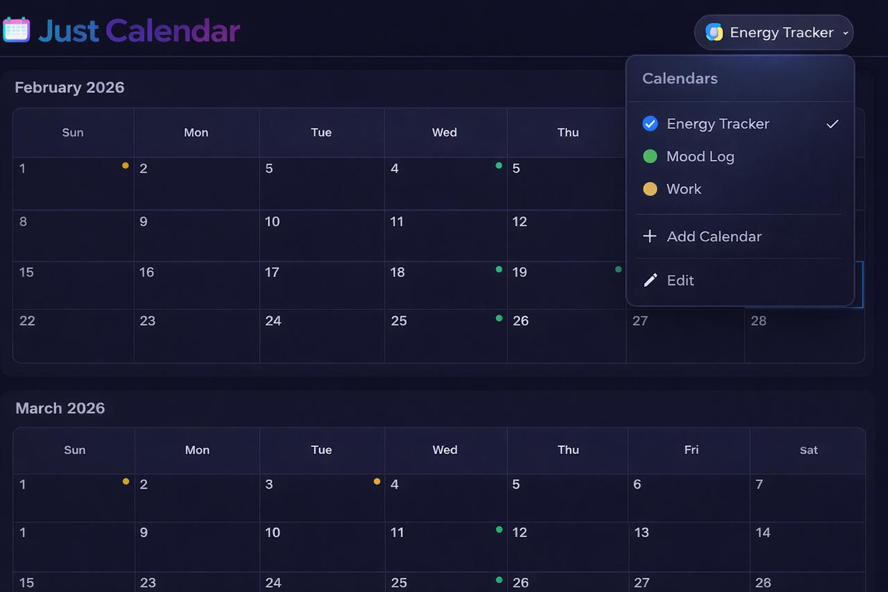 /root/justcal/index.html.Dark mode / Light modelocalStorage (justcal-theme)npm run build passed in ~/justcal